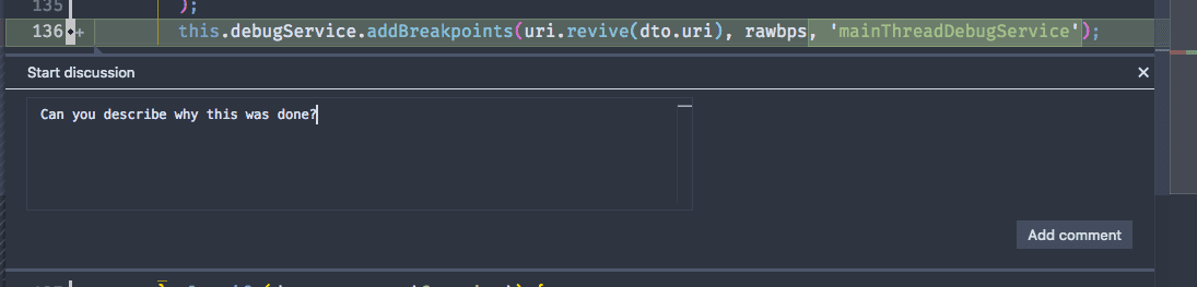 As well, if you open up one of the staged files to be merged in, it will present it in a diff view similar to if you made changes in a local file. Commenting support exists directly in the diff editor as if you opened a file in the PR view on GitHub’s website. If you click on the white gutter next to changes, a textbox will dropdown which you can write comments on the code inline.