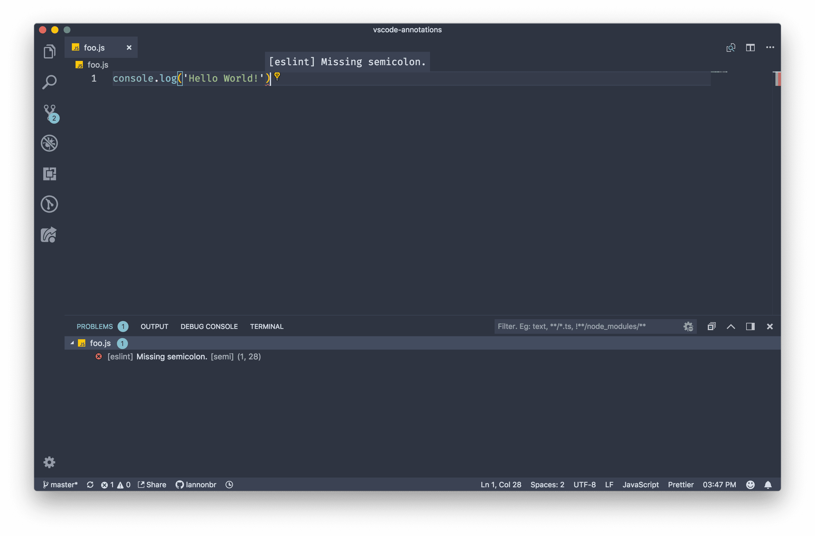 As well, given it is using the ESLint CLI behind the scenes, if you add any plugins or use presets, it just will work. As well, you can enable the eslint.autoFixOnSave setting in your user settings which will fix any errors as soon as you save.