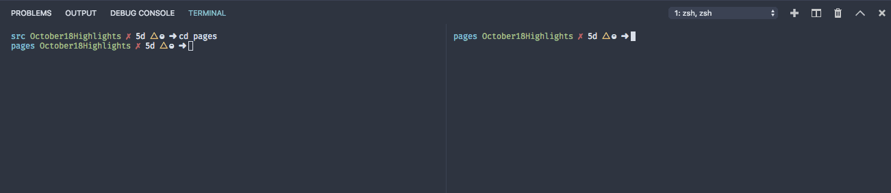 For a few updates now, you can split the terminal view to have many terminals open in the panel. That said, if you opened a new terminal with cmd+\, it would open the root folder of the workspace. Now in the October release, the terminals will open in the directory the terminal to the left of it was so you don’t need to continuously dive into a deeply nested folder if you want multiple instances of it. You can modify this setting by editing terminal.integrated.splitCwd. In the user settings screen.