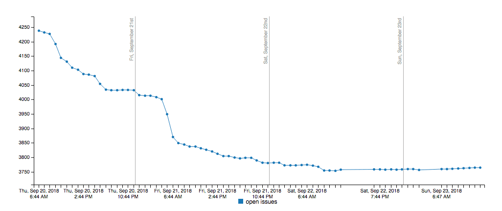 After letting this run continuously for over 10 days, I’ve been finding that the VS Code team has been fairly successful with their progress. As stated on the site as of when I wrote this, they started with over 5000 issues open and now have closed over 2000 issues since.