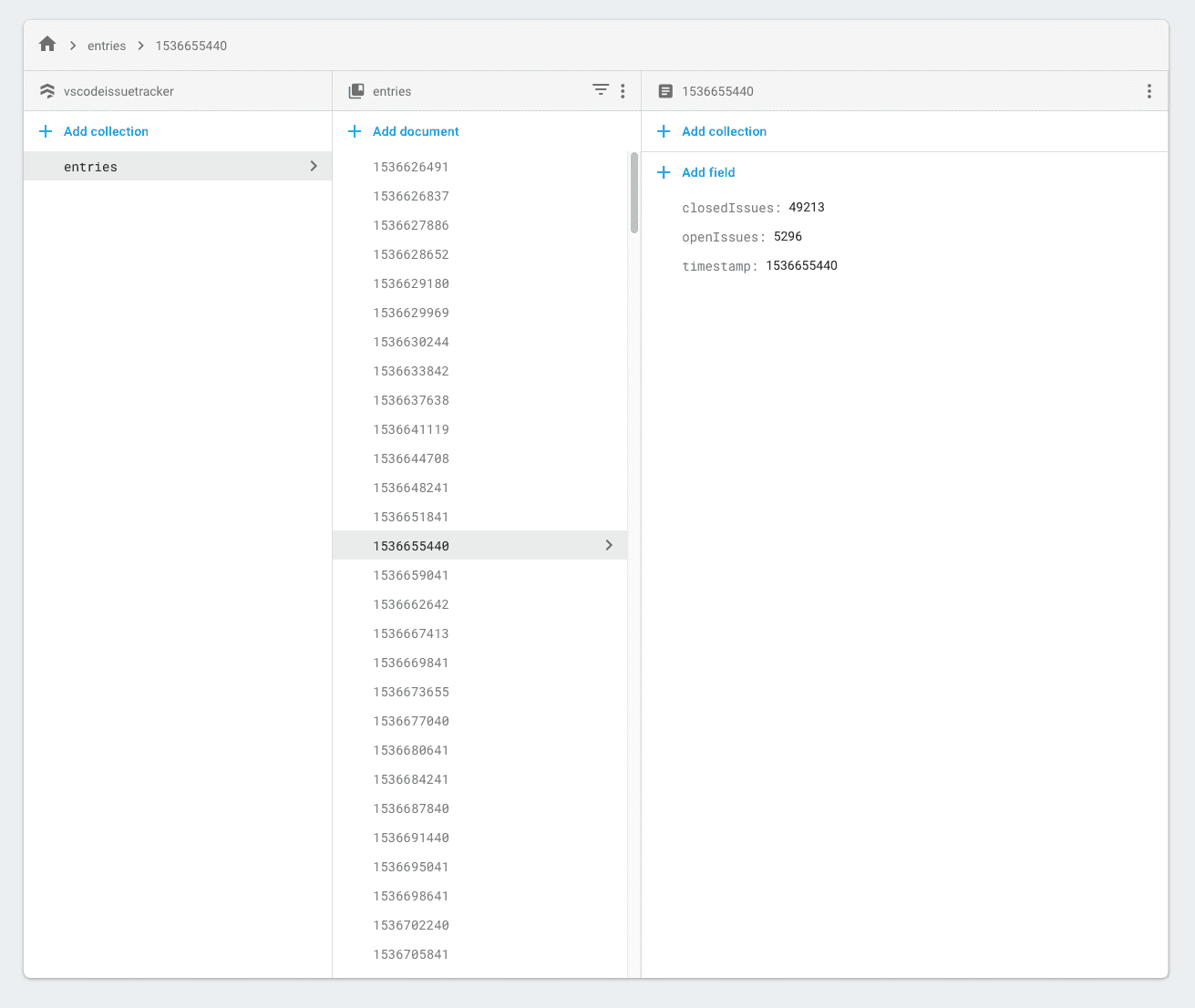 Each entry has the unix timestamp of when I grabbed the data as well as the number of open and closed issues on the repository. After setting everything up, the Lambda function will run once an hour and record the issue count at that time to then be consumed by the frontend.