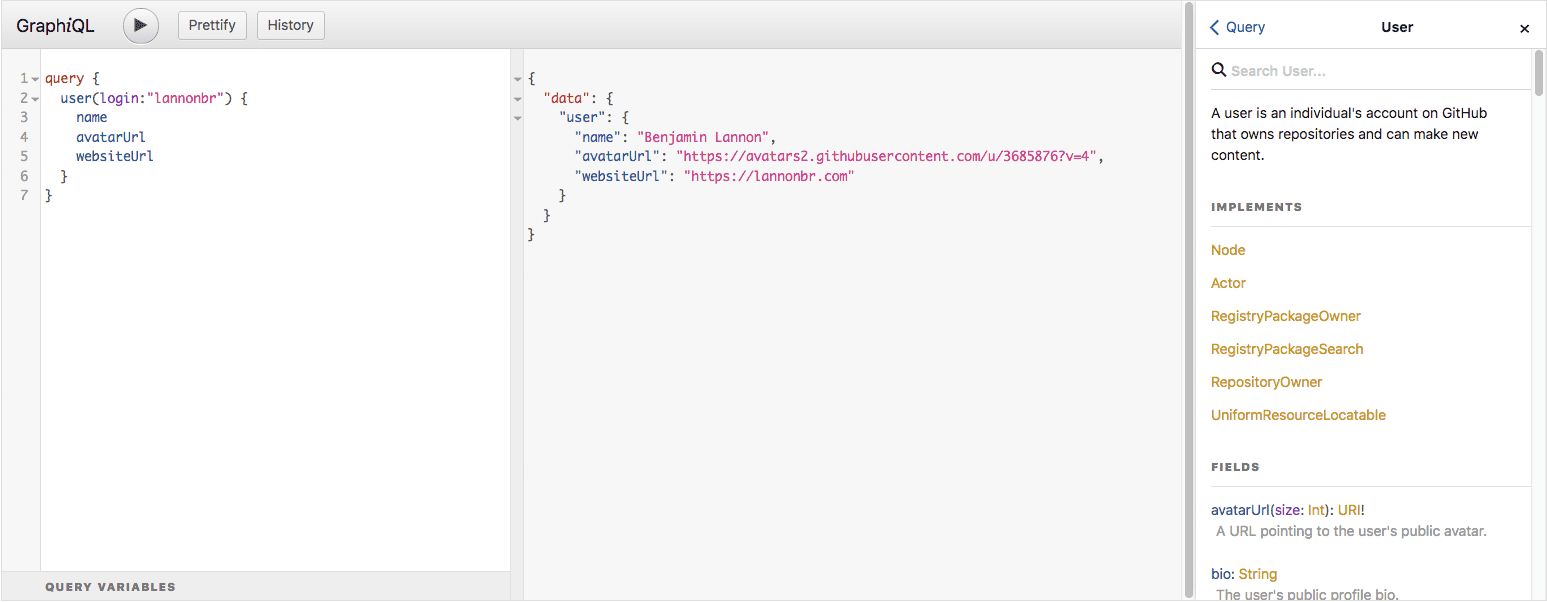 If you haven’t used GitHub’s new API before, they have an API explorer where you can test the API out using GraphQL’s GraphiQL editor which gives query autocompletion and built in docs as seen below. The API explorer can be found at https://developer.github.com/v4/explorer/ which just requires you to login with GitHub.